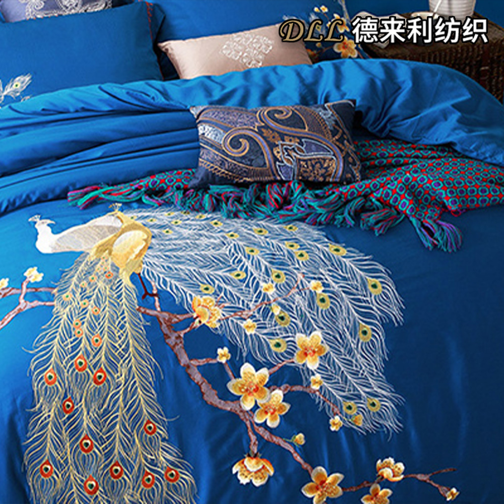 طقم مفروشات مكون من 4 قطع مطرز بالطاووس الأزرق الكوبالت